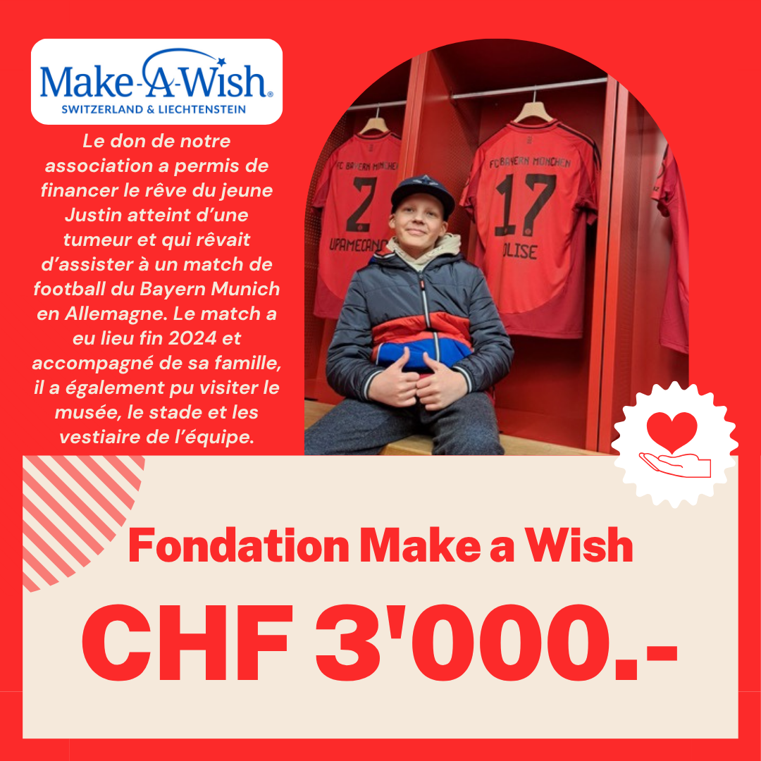 notre don a permis de réaliser le rêve du jeune Justin atteint d’une tumeur et qui rêvait d'aller voir un match du Bayern Munich en Allemagne. Son rêve s’est réalisé en fin d’année 2024.